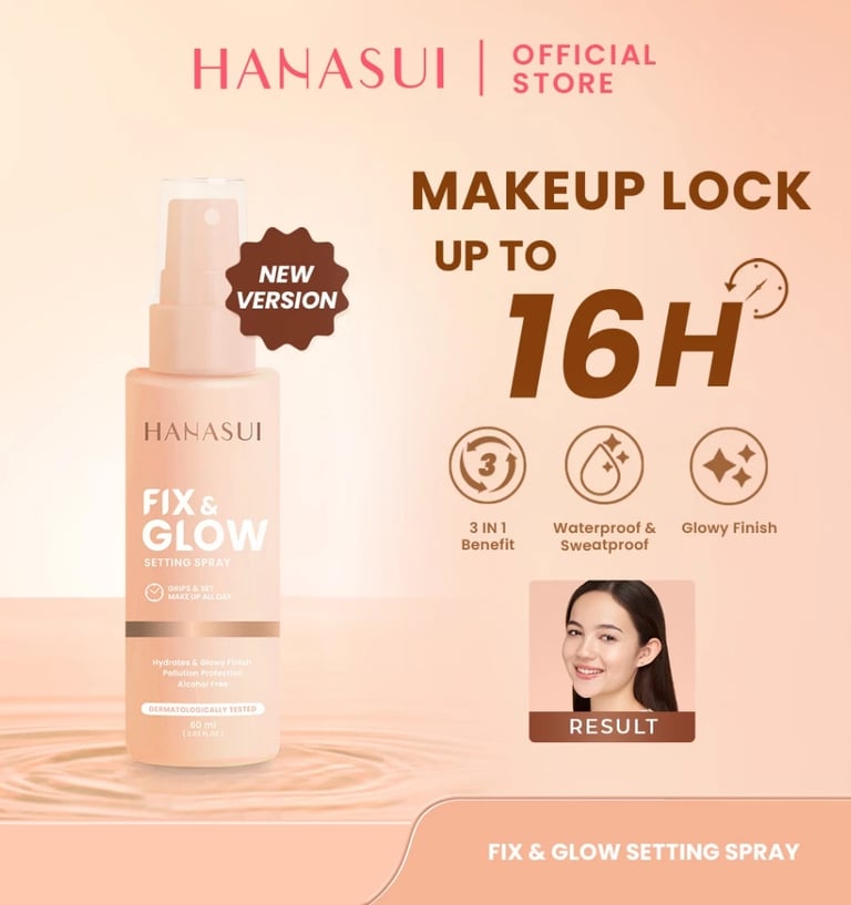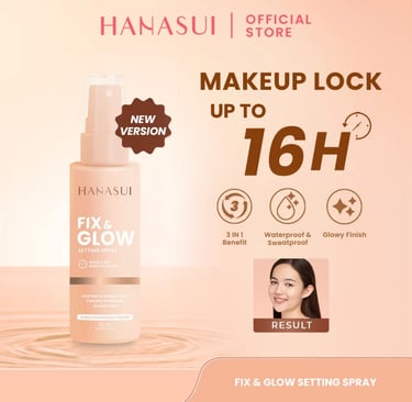 Hanasui Fix & Glow Setting Spray - Setting Spray Glowy Finish Make Up Menghidrasi Kulit MaskProof Tahan Lama