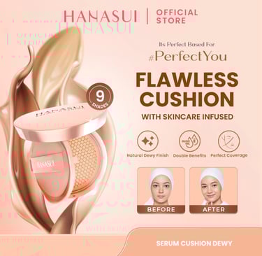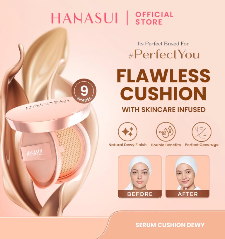 Hanasui Serum Cushion - Flawless Natural Dewy Finish UVA & UVB Protection Perfect Coverage Menyamarkan Pori-Pori Garis Halus Noda Wajah